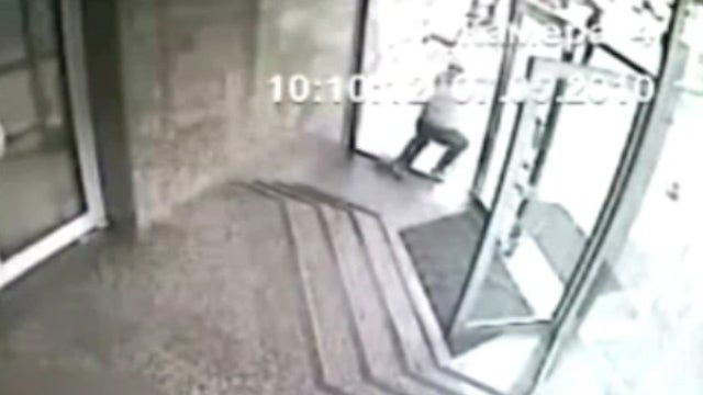 Dieser Mann hat es offenbar eilig und scheint wohl der Meinung zu sein, dass die sich vor ihm befindende Glastüre offen ist. Es handelt sich zum Glück um Sicherheitsglas, das zwar in tausend Scherben zerspringt, den Mann aber nicht verletzte.
