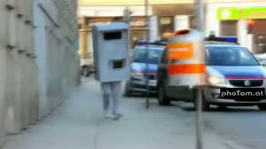 Eine lebende Radar-Box sorgt für Aufsehen und Lacher auf Wiens Straßen. Dahinter steckt der People-Fotograf Thomas Busek, der mit dieser Faschingsaktion dem närrischen Treiben in Wien einen lustig gemeinten Schlusspunkt aufsetzen möchte.