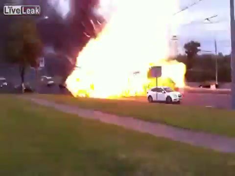 Ein Auto beginnt zu brennen. Der Fahrer habe vergeblich versucht, mit einem Feuerlöscher die Flammen zu bändigen, schreiben die Filmer. Plötzlich geht der Wagen in in einem riesigen Feuerball auf.