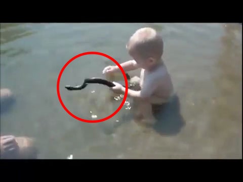 Vor den Augen der Eltern spielt dieses russische Kleinkind beim Planschen im kühlen Nass mit einer Wasser-Schlange.