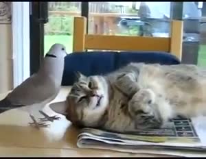 Diese Taube vergönnt der Katze partout nicht ihren Mittagsschlaf. Der Vierbeiner lässt sich das auch noch ganz schön lange gefallen, bis er "zuschlägt".