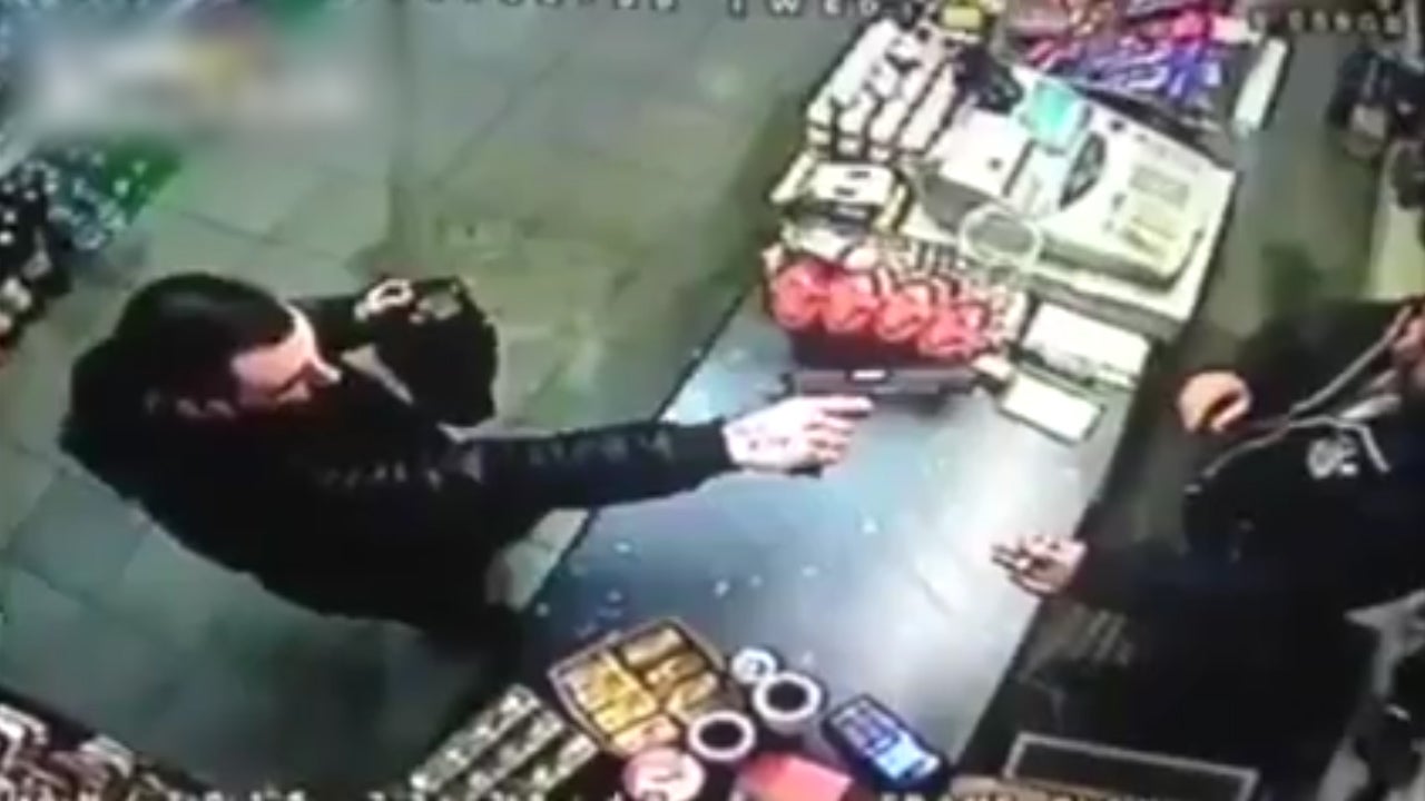 Eine Sekunde der Unachtsamkeit reicht und der Verkäufer entreisst dem Räuber die Waffe.