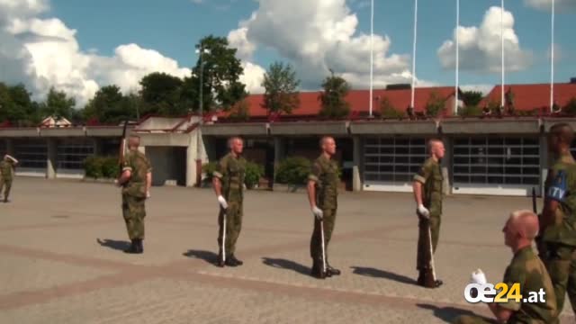 Diese Soldaten aus Norwegen haben lange für diese Performance geübt. Das gefährliche Manöver gehört zum Übungsprogramm der Königsgarde. Es wird eine M1 mit einem scharfen Bajonett geworfen.