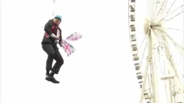 Das sollte anders laufen: An einem Drahtseil wollte Londons Bürgermeister Boris Johnson über die Köpfe der Olympia-Fans im Victoria-Park gleiten. Doch der Konservative kam nicht weit: Mitten auf dem Weg blieb er über den amüsierten Zuschauern hängen.