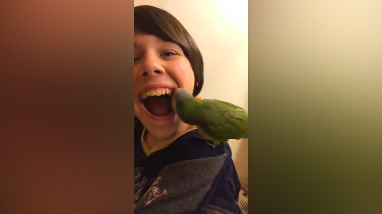 Ein junger Mann lässt sich einen seiner Milchzähne von seinem Papagei ziehen.