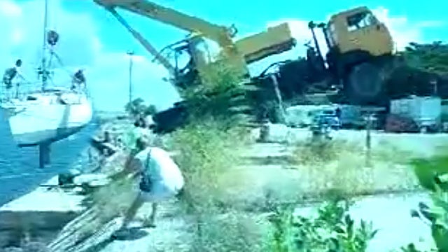 Ein ziemlich peinliches Missgeschick passierte diesen Helfern beim Verladen eines Segelbootes. Das Gewicht der Last völlig unterschätzt, kippt der Kran nach vorne.