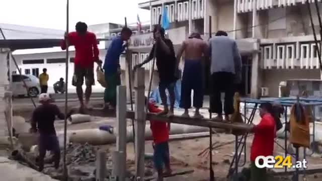 Die Not macht erfinderisch. Aus Mangel an schweren Baugerät versenken diese Arbeiter einen Pfosten mit ihrem Eigengewicht und dies scheint scheinbar auch richtig Spaß zu machen.