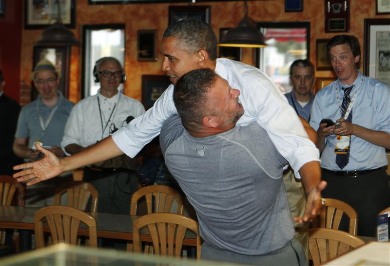 Auf Obamas Wahlkampftour durch Florida machte der US-Präsident Barack auch in einer Pizzeria Halt. Bei noch etwas festerer Umarmung, hätte er wohl auch mit dem SecretService auf Tuchfühlung gehen müssen.