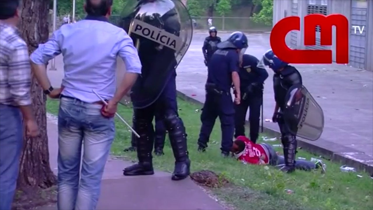 Die Fernsehbilder zeigen, wie ein Fan von Benfica Lissabon von Polizisten geschlagen wird.