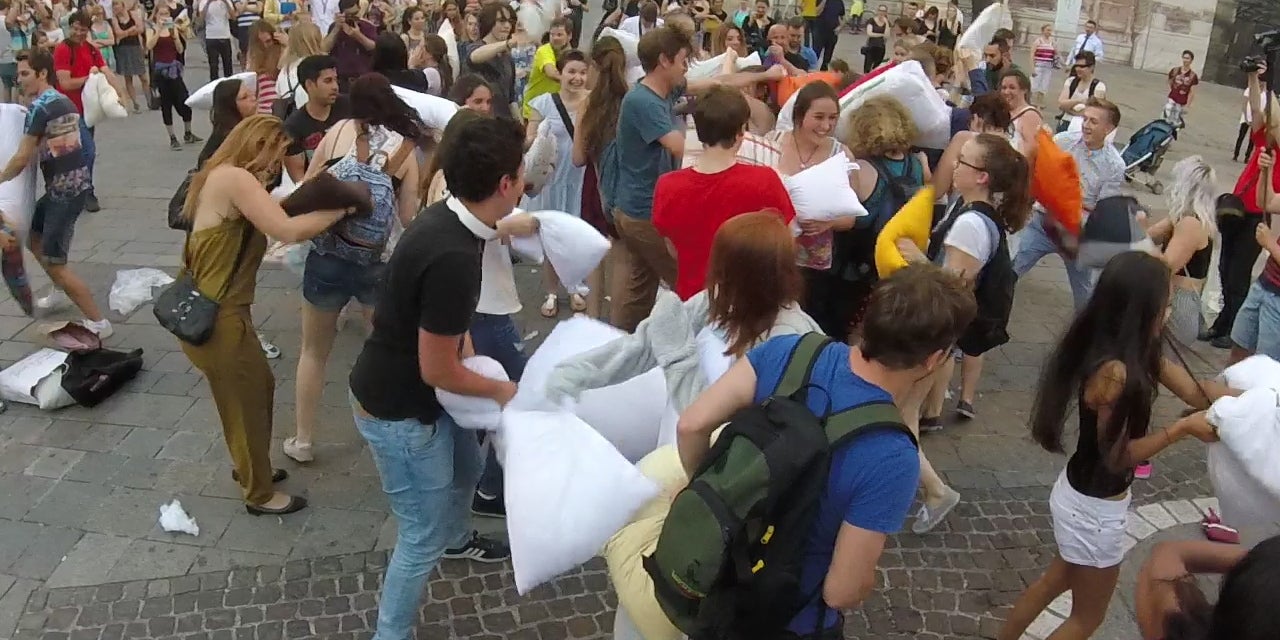 Kissen-Kämpfer veranstalteten eine hitzige Polsterschlacht in Wien.