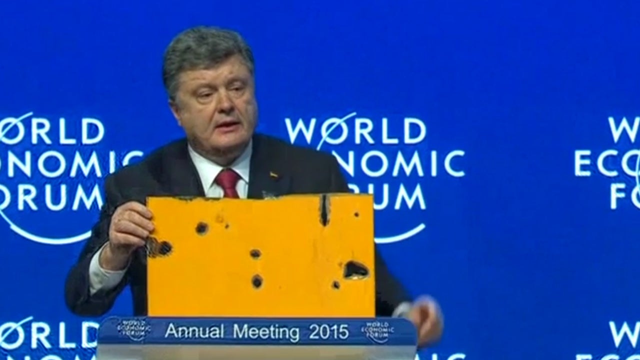 Der ukrainische Präsident zeigt Karosserieteile eines durchlöcherten Busses.