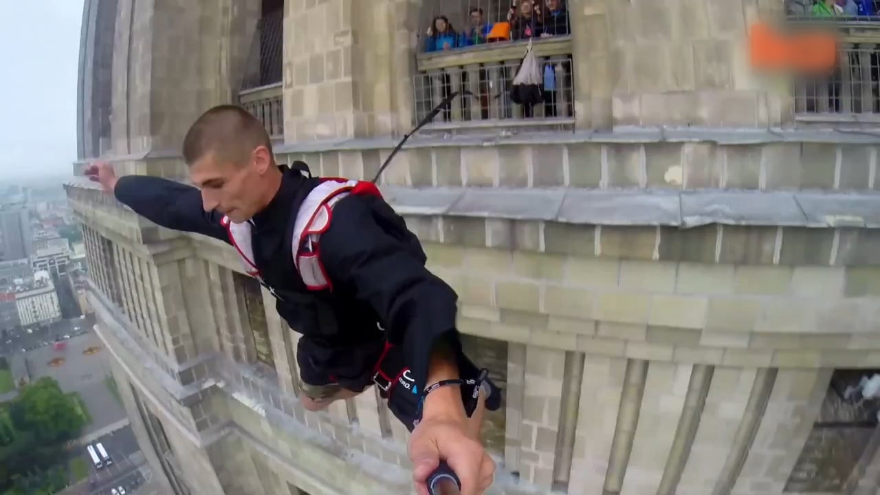 Base-Jumper als Priester verkleidet springen vom Warschauer Kulturpalast.