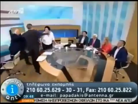 Erschreckende Szenen bei einer Talkshow im griechischen Fernsehen. Ilias Kasidiaris von der rechtsextremen Partei 'Goldene Morgenröte' greift während einer Live-Sendung am Donnerstag plötzlich zwei linke Parlamentarierinnen an.