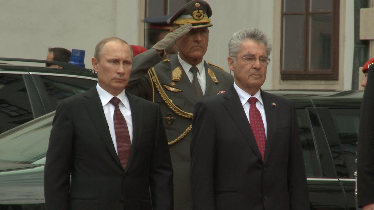 Russlands Präsident Wladimir Putin kommt in Wien an und wird von Bundespräsident Heinz Fischer begrüßt.