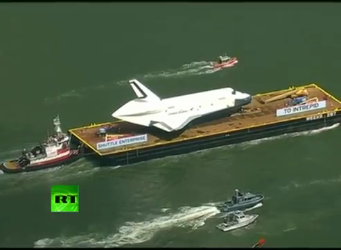 Das US-Space Shuttle "Enterprise" hat seine letzte Reise angetreten. Ein Frachtkran bringt das Shuttle, vorbei an der Freihheitsstatue und unzähligen Bewunderern, zu ihrer letzten Ruhestätte, dem See-, Luft- und Raumfahrt-Museum von New York.
