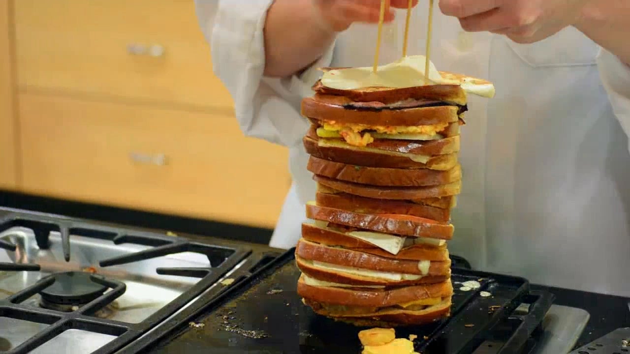 Vor kurzem war der "National Grilled Cheese Day"- aus diesem Anlass wird ein 20 Scheiben hoher Toast "gebaut".