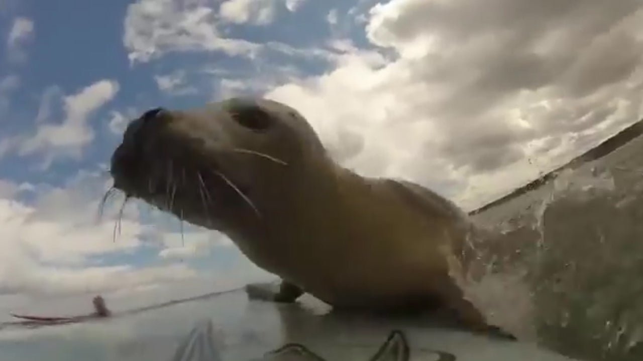 Diese Robbe will auch mal aufs Surfbrett und die Wellen genießen.