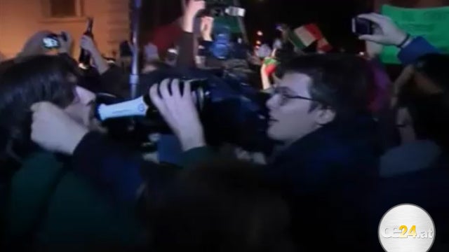 Nach dem Rücktritt Berlusconis: Wildfremde liegen sich in den Armen, viele tanzen, manche wischen sich die Tränen ab. Junge Männer bilden eine Polonaise, taumeln im Überschwang über den Platz. „Endlich, endlich, wir sind frei!“