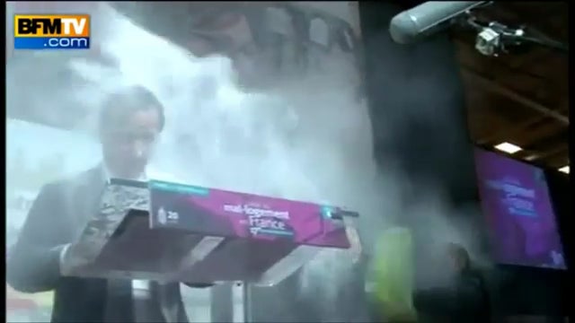 Im französischen Präsidentschaftswahlkampf staubt's momentan: Francois Hollande, der größte Herausforderer von Nicolas Sarkozy, ist am Mittwoch am Redner-Pult Opfer einer Mehl-Attacke geworden.