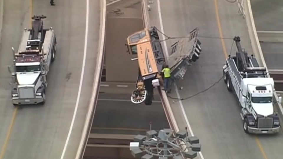 Ein Baufahrzeug hängt danach über einem Vorsprung an der Schnellstraße.