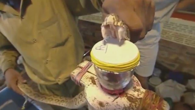 Der Mann nimmt eine Giftschlange und lässt sie auf einen Karton beißen. Dadurch gibt sie ihr Gift in das darunter stehende Gefäß ab. Im Anschluss wir das Gift mit einer Spritze aufgezogen. Nun werden nur wenige Tropfen davon mit Blut vermengt. Nach kurzem Schütteln gerinnt das Blut zu einer festen Masse. Man kann sich vorstellen, was das für einen Menschlichen Körper beziehungsweise dessen Blutkreislauf nach einem Biss bedeutet...
