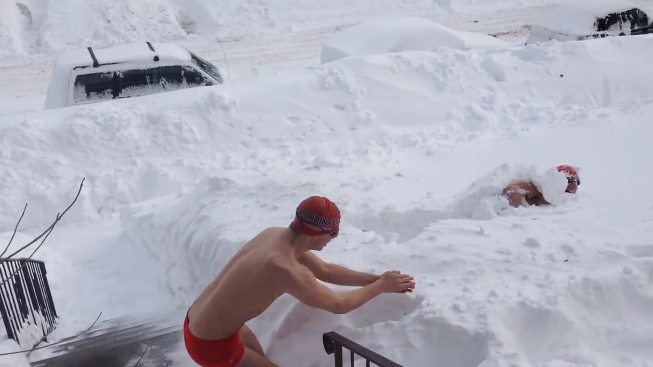 Schnee-Chaos in USA: Zwei verrückte Schwimmer aus Minnesota erlauben sich einen Scherz und praktizieren "Schnee-Schwimmen." Wie genau das aussieht, können Sie in diesem Video sehen!