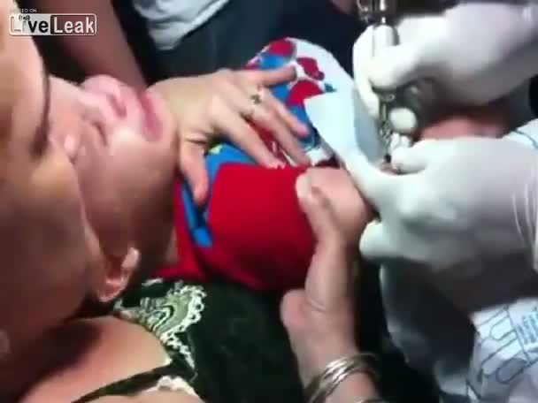 Schreiend und völlig verängstigt versucht dieser Dreijährige den schmerzvollen Stichen einer Tätowierungsnadel zu entkommen. Gegen seinen Willen wird der Junge von der eigenen Mutter festgehalten.
