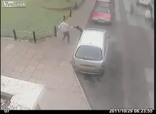 Der Mann dreht sich um seine eigene Achse, an seinem ausgestreckten Arm baumelt eine hilflose Katze. Der Kopf der Katze schlägt fast auf dem harten Beton auf. Passanten beobachten den brutalen Tierquäler ohne wirklich einzugreifen.