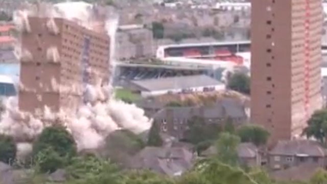 Eine spektakuläre Abrissaktion ist im schottischen Dundee geglückt: Zwei 25-stöckige Appartmentblöcke wurden zielgenau gesprengt, in wenigen Sekunden waren die Gebäude verschwunden. Eine Kirche, die genau dazwischen stand, blieb nahezu unbeschädigt.