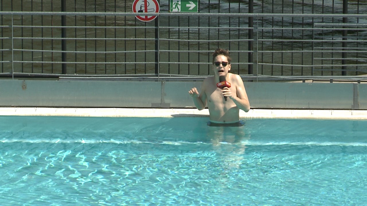 oe24-Reporter Manuel Tunzer probiert die Schwimmtauglichkeit des Beckens am Badeschiff.