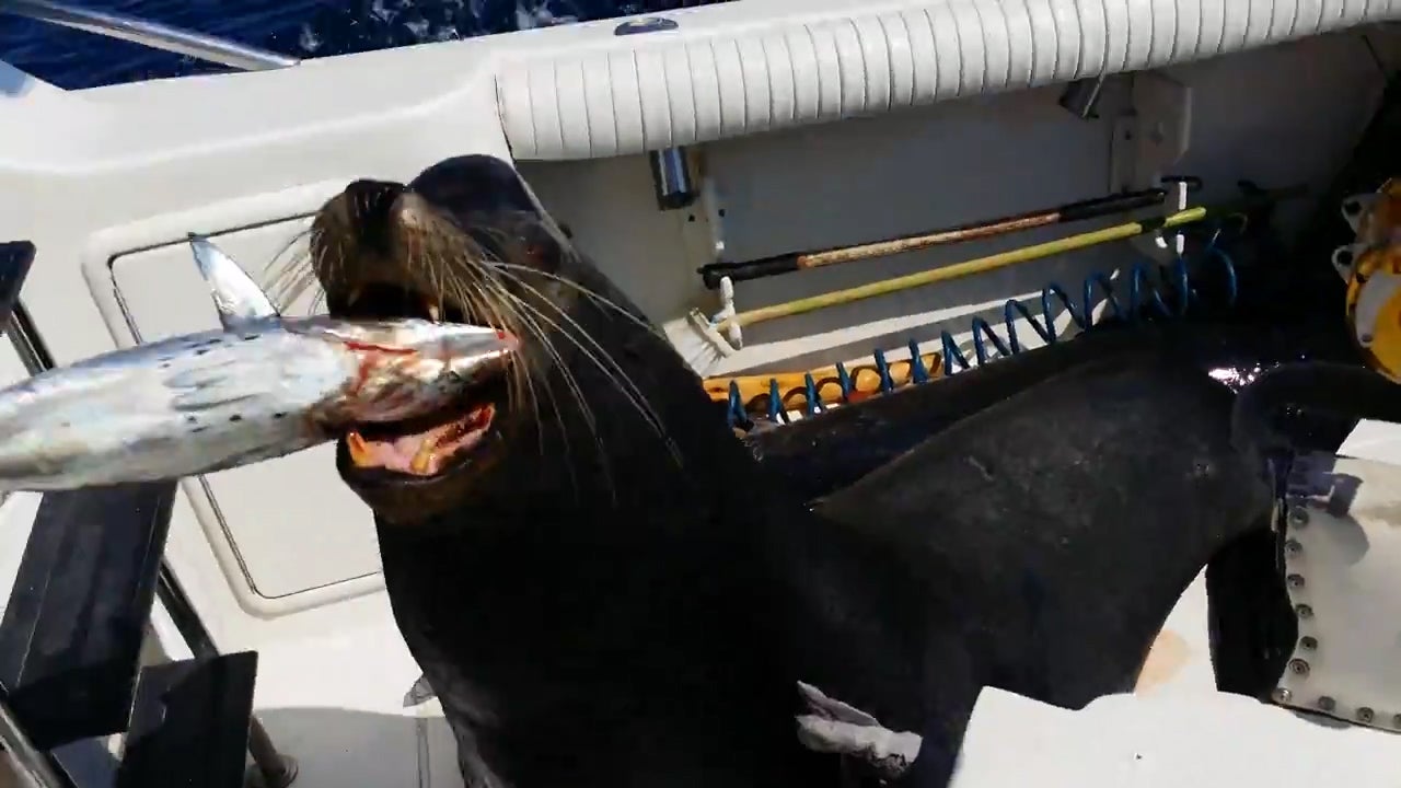 Dieser hungrige Seelöwe springt auf das Boot und bekommt Fressen.