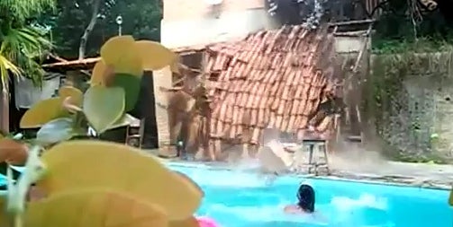 Slacklining ist angesagt. Diese jungen Menschen haben die geniale Idee, das seil über den Pool zu spannen, da tut man sich wenigstens nicht weh, wenn man ins kühle Nass fällt. Aber was, wenn der Stützpfeiler des Sonnendachs nicht stark genug ist ?