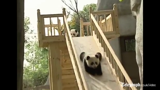 Baby-Pandas rutschen in einer chinesischen Zuchtstation um die Wette und haben einen Riesenspaß.