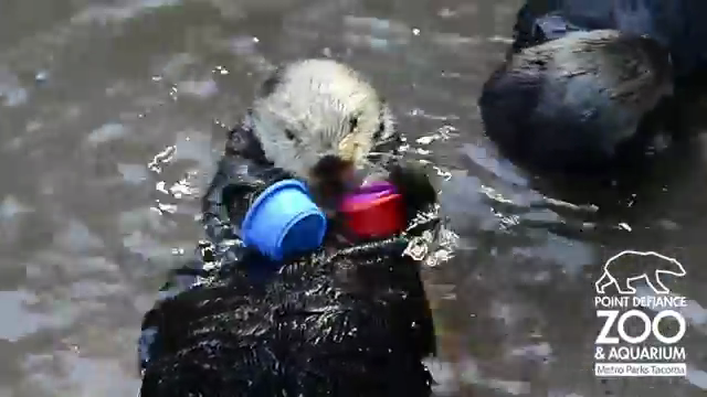 Diese Seeotterdame hat ein ziemlich außergewöhnliches Hobby, sie stapelt mit Vergnügen Hütchen aufeinander. Und das so, als hätte sie nie etwas anderes gemacht.