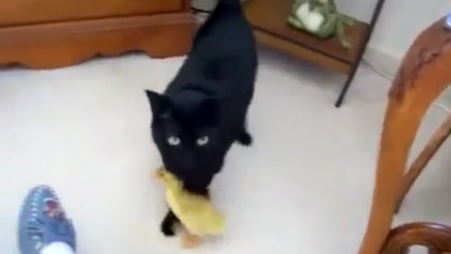 Dieses Küken hat sich eine ungewöhnliche Ersatzmuttter gesucht und folgt einer Katze auf Schritt und Tritt.
