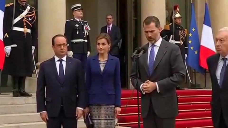 Felipe VI. trifft in Paris Präsident Hollande nach schwerem Flugzeugunglück von Germanwings-Maschine.