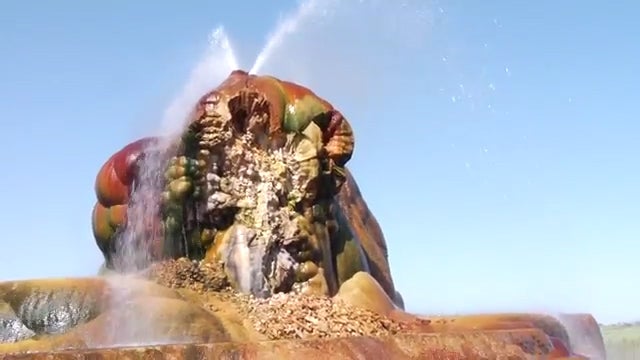Um die Wüste Nevadas (USA) in Farmland zu verwandelt, suchte man auf der Fly Ranch 1916 nach einer natürlichen Quelle und stieß dabei auf eine ausgedehnte unterirdische Kammer, welche angebohrt wurde. Über die Jahrzehnte bildete sich der "Fly Geysir". Ablagerungen aus Kalziumkarbonat sorgten für die Ausbildung wunderschöner Terrassen und thermophile Bakterien und Algen für die einmalige Farbenpracht.