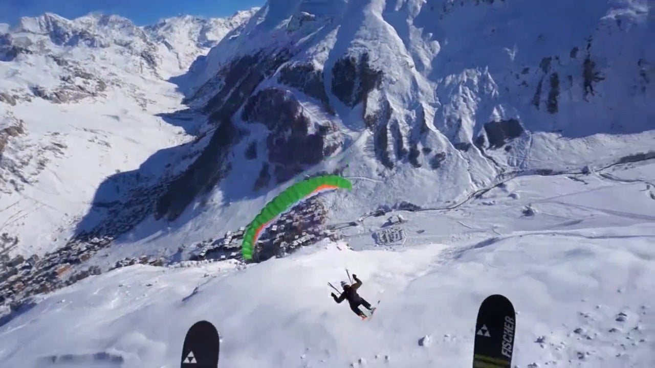 Mit ihrem Fallschirm rauschen diese beiden Speedrider den Berg hinunter.