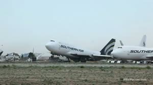 Diese Boeing 747 der Fluggesellschaft ‚Southern Air’ hebt von ganz alleine ab – nur von den starken Windböen alleine auf dem Flughafen von Mojave in Kalifornien.