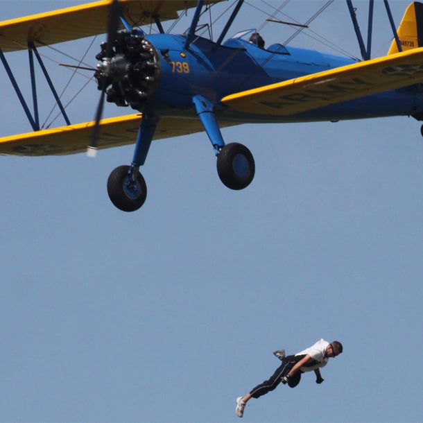 Horror-Unfall im US-Bundesstaat Michigan: Ein Stuntman stürzte 200 Meter tief in den Tod. "Wing-walker" Todd Green sollte bei einer Flugshow von einem Doppeldecker-Flugzeug in einen darüberfliegenden Helikopter steigen. Doch der Stunt misslang.
