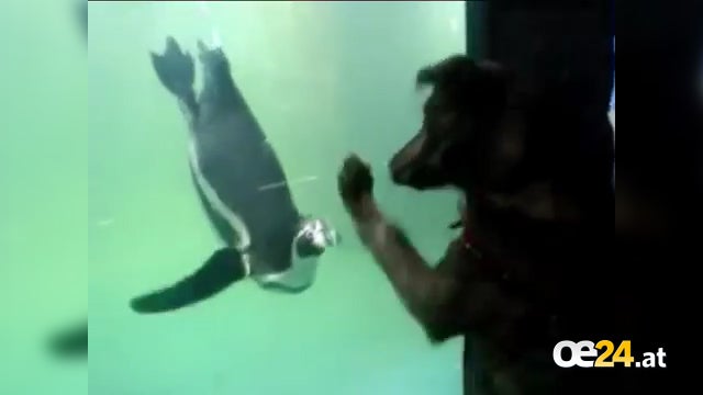 Schade eigentlich, dass eine dicke Scheibe zwischen den beiden ist – denn sonst hätten Hund und Pinguin sicher ganz toll miteinander gespielt.