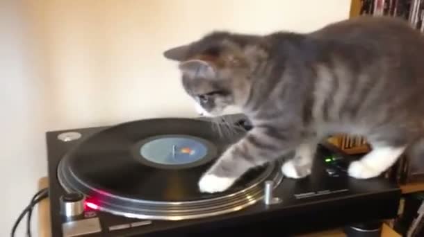 Diese Katze ist auf den Geschmack gekommen: Sie spielt sich gekonnt mit dem Plattenspieler und macht ihre ersten Erfahrungen als Reggae-DJ.