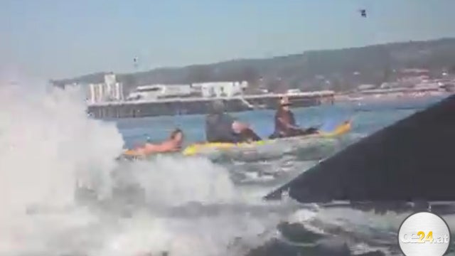 Dies ist keine Szene aus einem Horrorfilm. Ein Buckelwal erhebt sich aus dem Wasser und scheint eine Surferin verschlucken zu wollen.