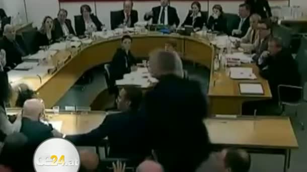 Ein Unbekannter attackiert den Medienzar mit einer Schaumtorte mit den Worten "Schmierig, gierig"