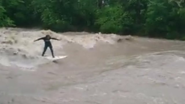 Hochwasser-Surfen ist der neue sportliche Trend. Dieser Surfer nützt die Wellen für einen coolen Ritt über das Wasser.