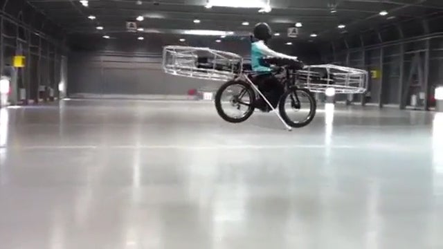Haben wir nicht schon alle in unserer Jugend von einem fliegenden Fahrrad geträumt? Die tschechischen Erfinder Milan Duchek und Ales Kobylik sind große Kinder und verwirklichten den Traum. Jetzt präsentierten die beiden ihr fliegendes Fahrrad. Bestückt mit sechs Propellern hob der knapp über 100 Kilogramm schwere Prototype einer Halle in Prag ab. Allerdings noch ferngesteuert.