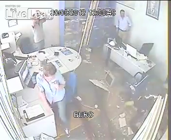 Völlig vertieft in ihre Arbeit, ahnen diese Angestellten noch nichts von dem gleich folgenden Unfall. Freudig unterhalten sich zwei von ihnen, als plötzlich ein Arbeiter durch die Decke bricht.
