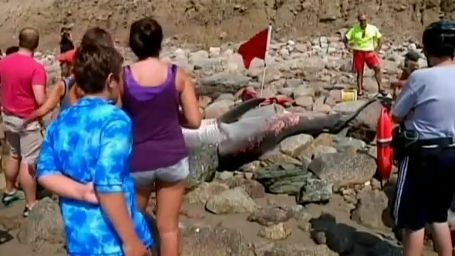 Weißer Hai an Land: An der Küste von Rhode Island ist ein riesiges totes Exemplar des Meeresräubers angeschwemmt worden.