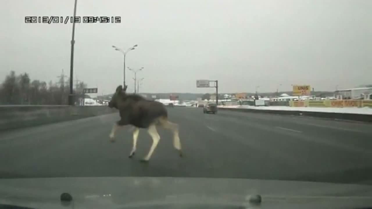 Wie aus dem Nichts taucht plötzlich ein Elch zwischen den Autos auf, rutscht aus und läuft auf der Überholspur weiter.