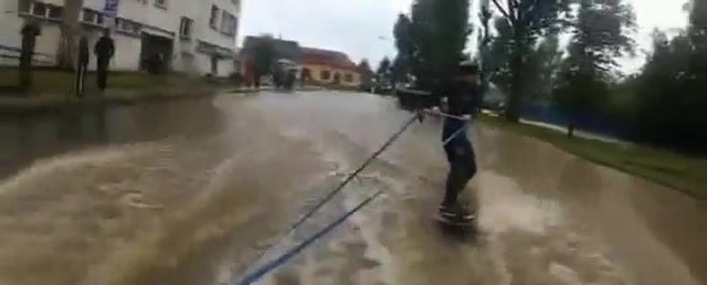 Eine Frau aus Tschechien hat für sich einen positiven Aspekt des Hochwassers gefunden und lässt sich von einem Auto durch die Straße ziehen. In Tschechien sind die Pegelstände allerdings nicht so drastisch wie in Österreich.